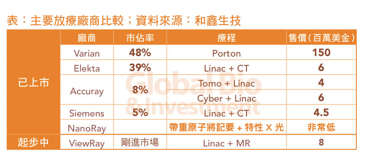 不過,目前放療主要市場仍由 Varian( 市占率 48%)、Elekta(39%)、 Accuray(8%)、Siemens(5%) 等國際大 廠寡占,和鑫計畫在該領域採取與 大廠攜手,以加速切入國際市場。